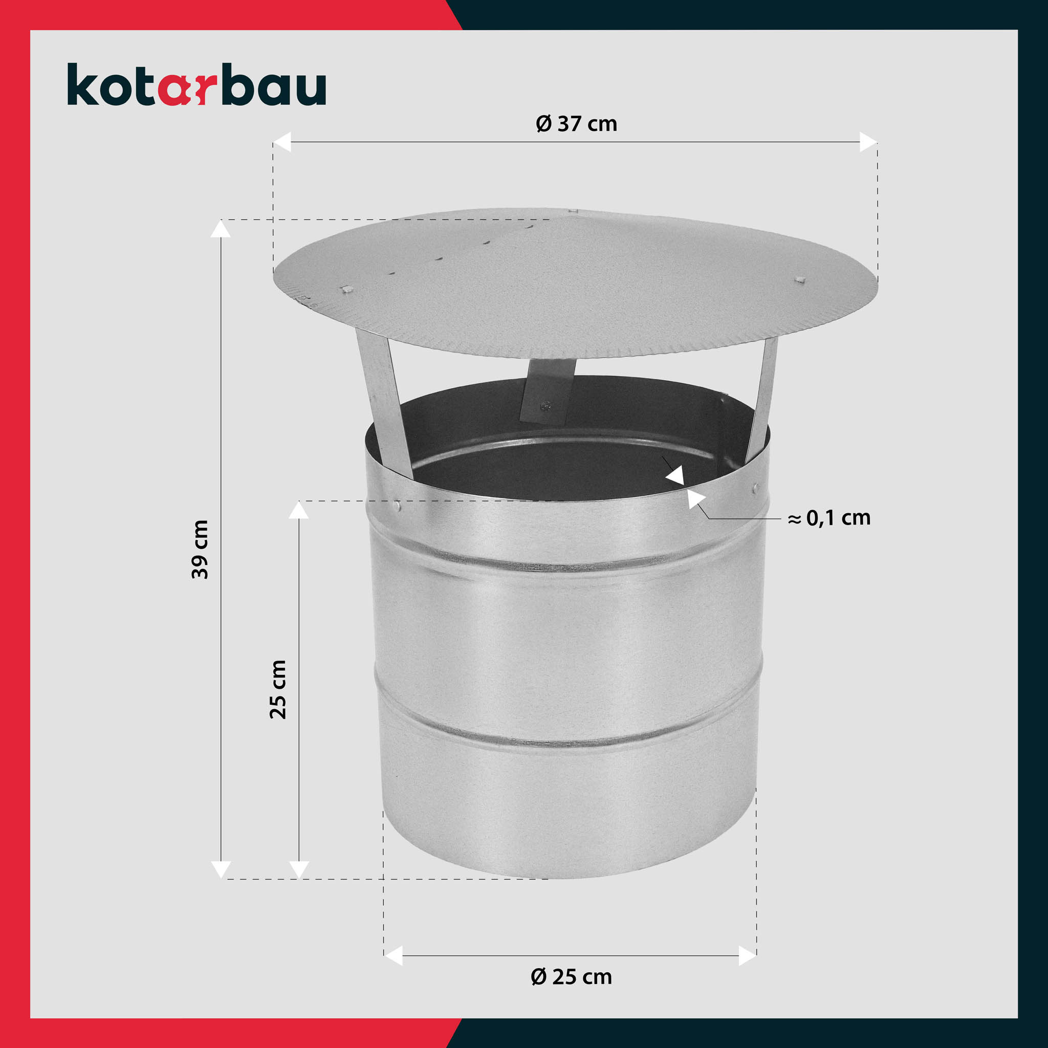 - Komínová strieška je vyrobená z vysoko kvalitnej pozinkovanej ocele, odolnej proti korózii a mechanickému poškodeniu. Proces galvanizácie vytvára účinnú ochrannú vrstvu, ktorá chráni kov pred hrdzou aj v prostredí so zvýšenou vlhkosťou.