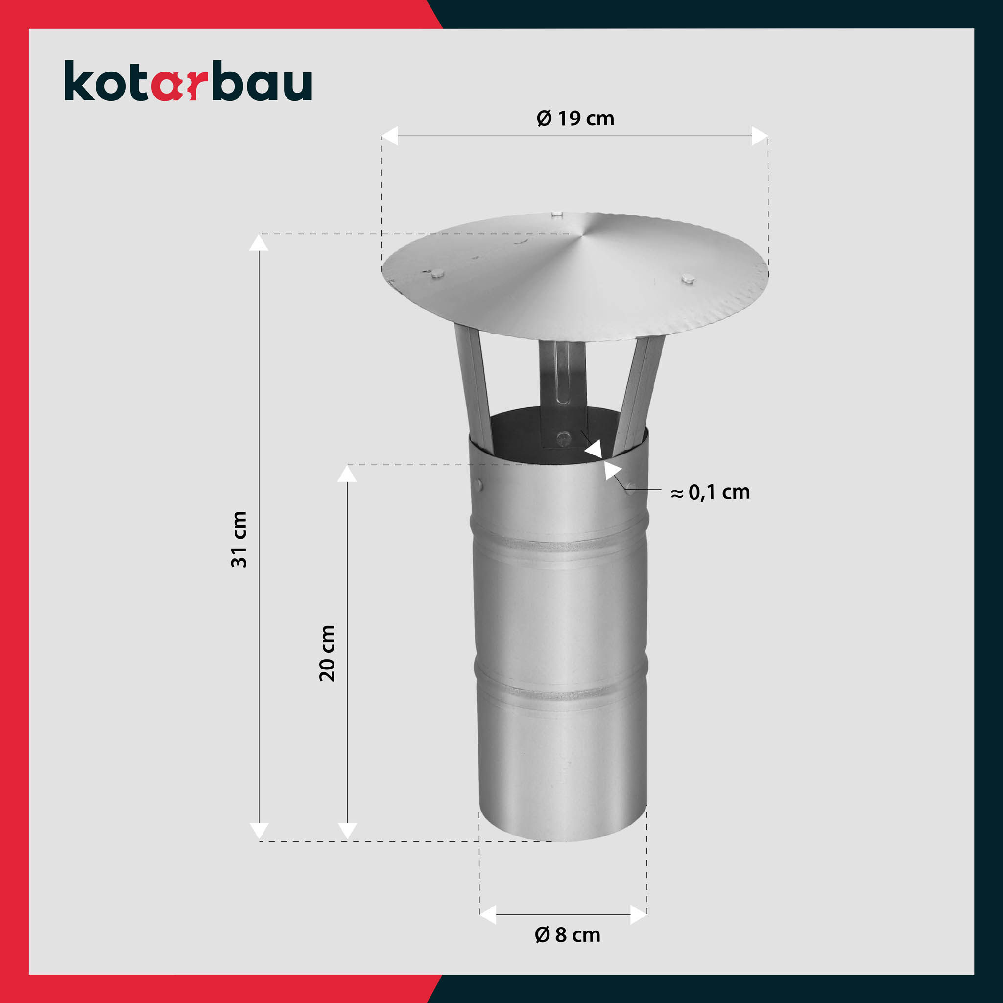 - Komínová strieška je vyrobená z vysoko kvalitnej pozinkovanej ocele, odolnej proti korózii a mechanickému poškodeniu. Proces galvanizácie vytvára účinnú ochrannú vrstvu, ktorá chráni kov pred hrdzou aj v prostredí so zvýšenou vlhkosťou.