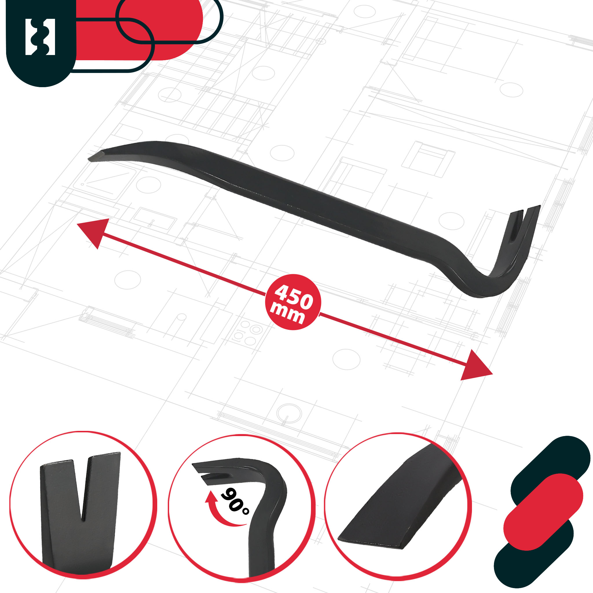 - Obojstranná konštrukcia páčky zvyšuje rozsah jej využitia. Zploštený, mierne zahnutý koniec je skvelý na páčenie a rozbíjanie, zatiaľ čo silnejšie profilovaný koniec s výrezom umožňuje jednoduché odstraňovanie klincov alebo dosiek.