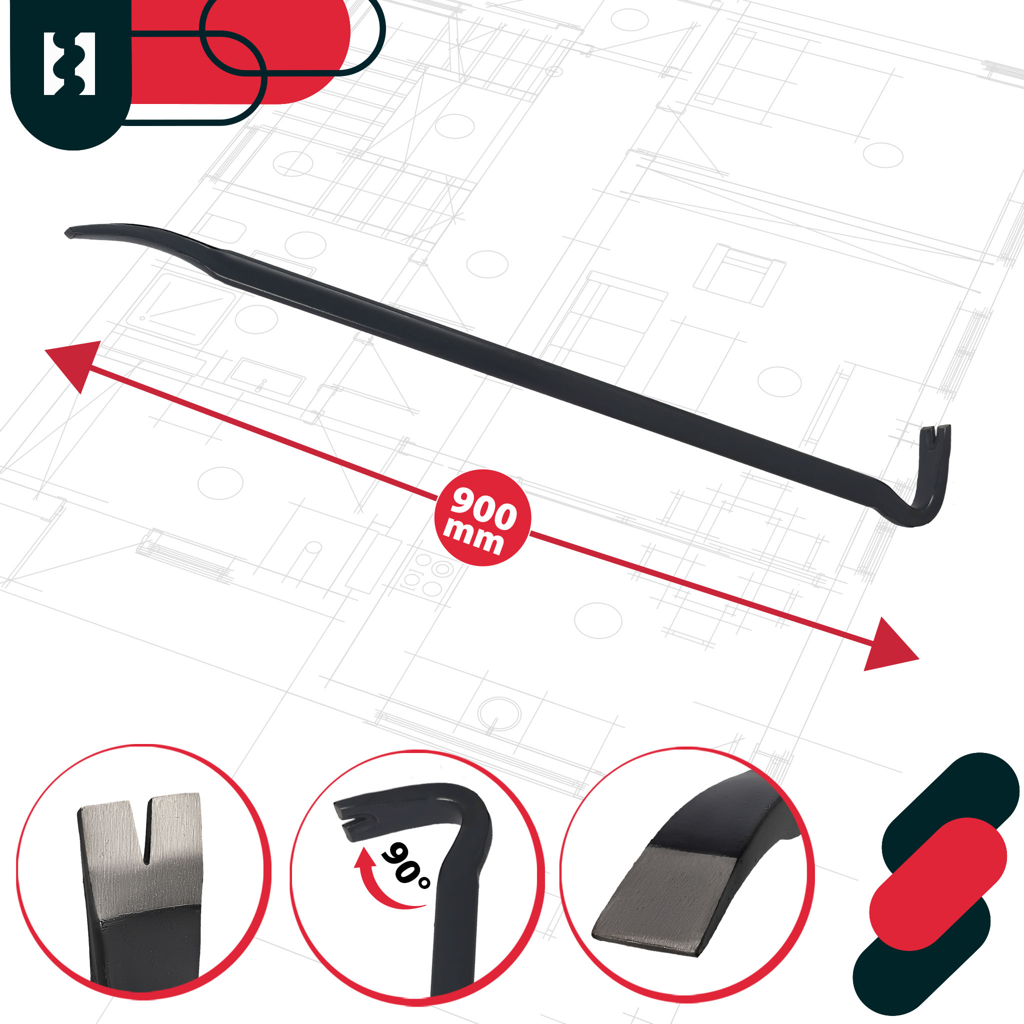 - Obojstranná konštrukcia páčky zvyšuje rozsah jej využitia. Zploštený, mierne zahnutý koniec je skvelý na páčenie a rozbíjanie, zatiaľ čo silnejšie profilovaný koniec s výrezom umožňuje jednoduché odstraňovanie klincov alebo dosiek.